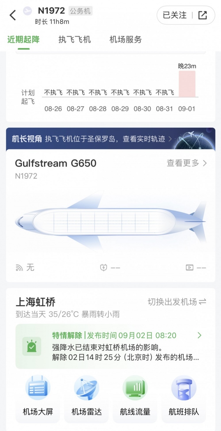 9月2日航空数据显示,一架注册号为N1972的私人飞机于当地时间21:23从波特兰国际机场起飞,预计于北京时间23:08抵达上海虹桥机场,全程飞行时间约11小时8分钟。