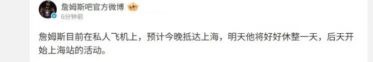 体育自媒体"詹姆斯吧官方微博"同步证实:"詹姆斯现已搭乘私人飞机,预计今夜抵达上海,明日将进行休整,后续按计划参与上海站公开活动。"