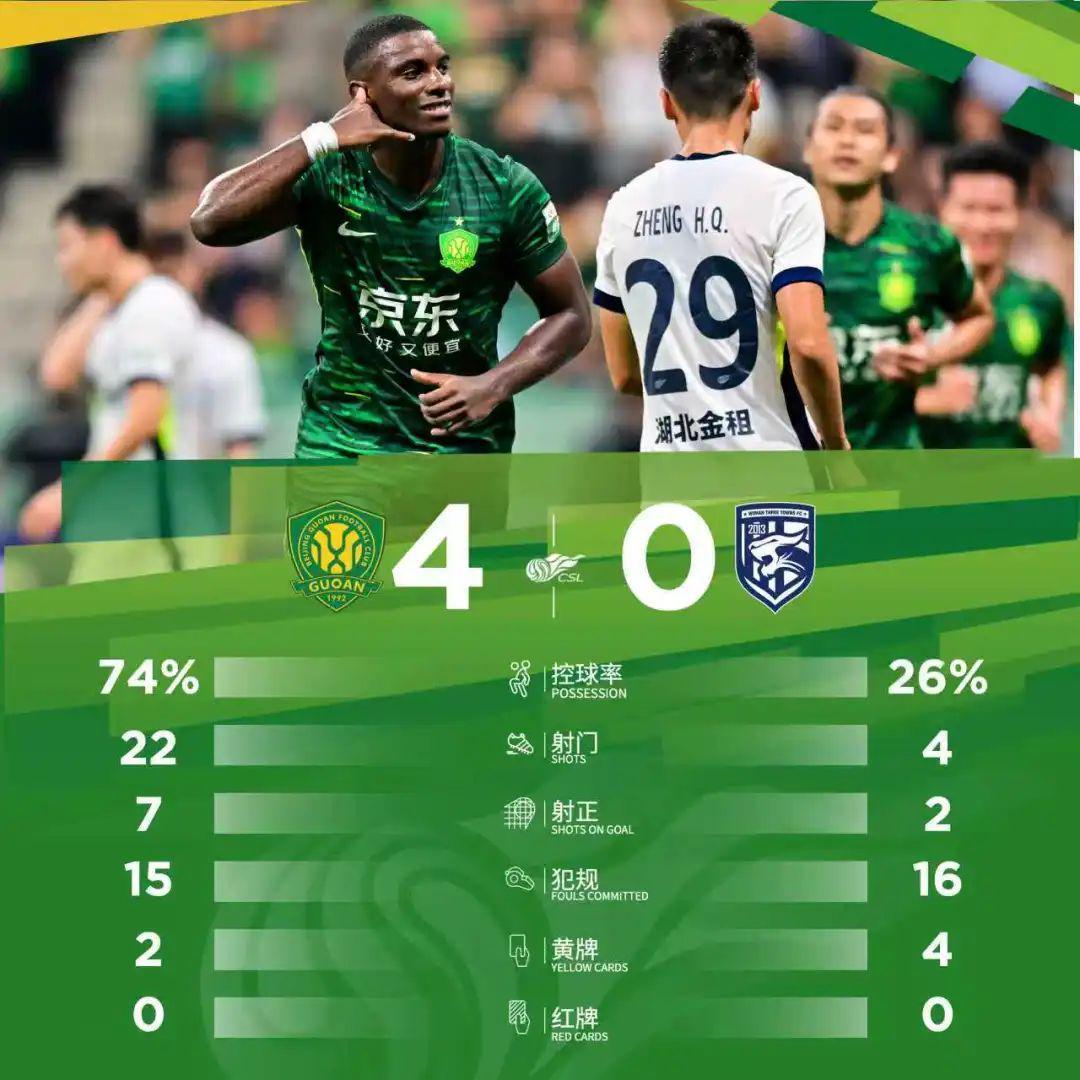 最终,北京国安主场4-0战胜武汉三镇。